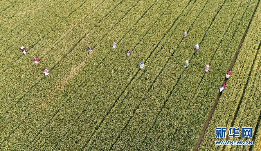 5月26日,農(nóng)民在內(nèi)丘縣東龐前街村麥田清理雜麥(無人機(jī)照片)。夏日時(shí)節(jié),河北省邢臺(tái)市內(nèi)丘縣農(nóng)民搶抓農(nóng)時(shí)開展麥田后期管理,為小麥增產(chǎn)豐收打好基礎(chǔ)。新華社記者朱旭東攝