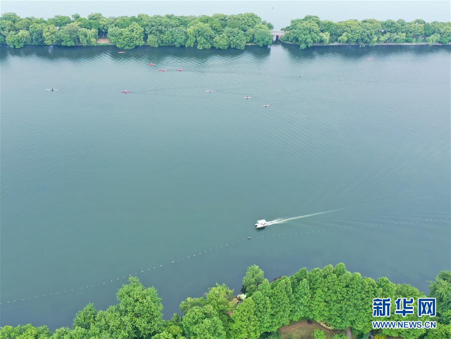5月27日,船只在西湖上行駛(無人機照片)。隨著氣溫升高,杭州西湖綠意蔥蘢,展現(xiàn)出柔美的湖光山色。新華社記者翁忻旸攝