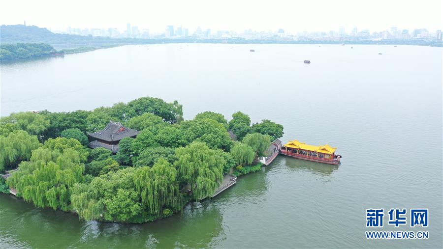 5月27日,船只在西湖湖心亭靠岸(無(wú)人機(jī)照片)。隨著氣溫升高,杭州西湖綠意蔥蘢,展現(xiàn)出柔美的湖光山色。新華社記者翁忻旸攝