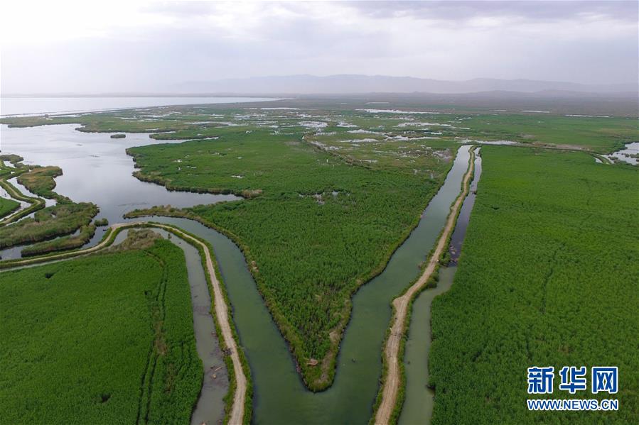 這是5月20日拍攝的新疆博湖縣博斯騰湖邊的蘆葦(無(wú)人機(jī)照片)。新華社記者宋彥樺攝