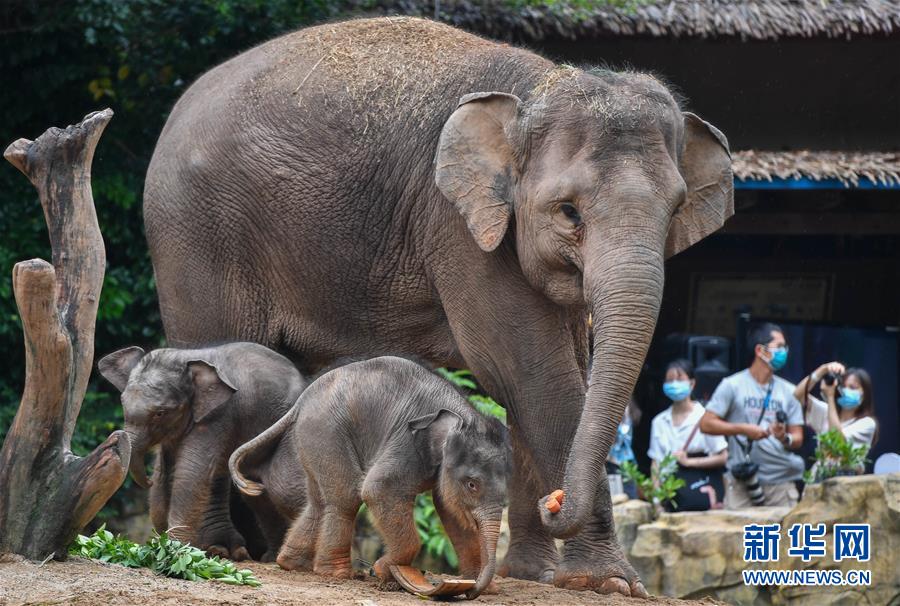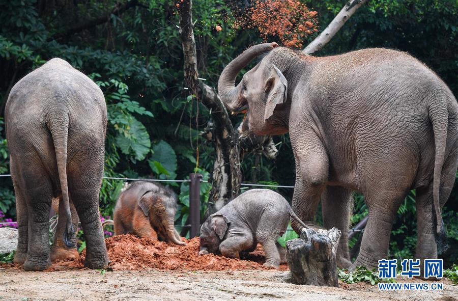 5月27日,廣州長隆的兩只新生亞洲象寶寶在媽媽的陪伴下玩耍。新華社記者劉大偉攝