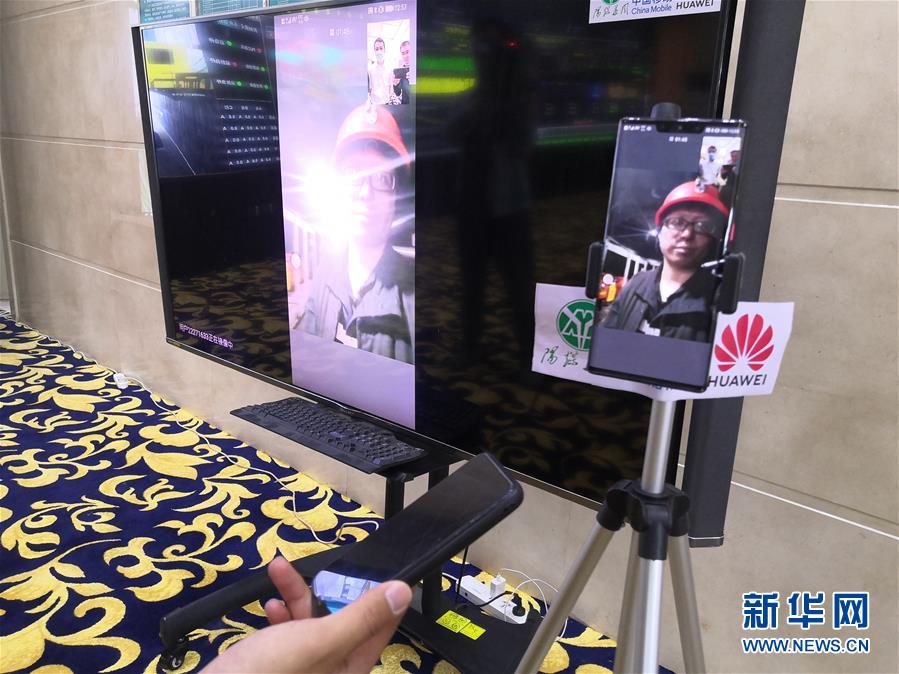 在山西陽煤集團(tuán)新元煤礦調(diào)度中心,記者通過5G網(wǎng)絡(luò)視頻采訪井下礦工(5月27日手機(jī)拍攝)。新華社記者梁曉飛攝