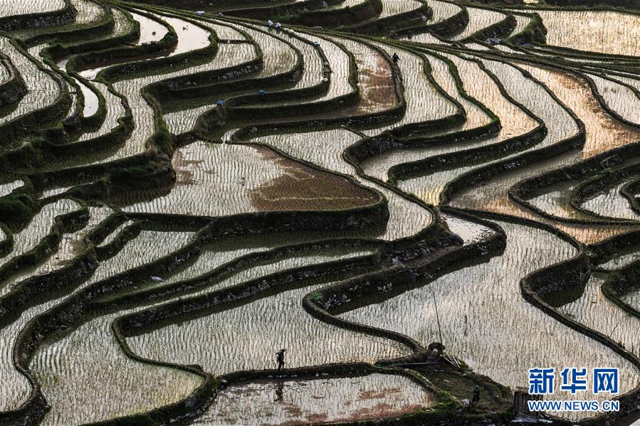 晨光中的從江縣加榜鄉(xiāng)加車梯田(5月28日攝)。夏日時(shí)節(jié),位于貴州省黔東南苗族侗族自治州從江縣加榜鄉(xiāng)加車、加頁(yè)、黨扭等苗寨的梯田在晨霧與陽(yáng)光的映襯下線條分明,光影變幻,景色如畫(huà)。新華社記者 楊文斌 攝