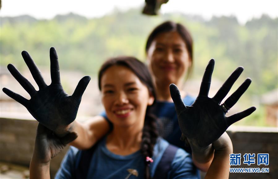 楊成蘭(前)與一名學(xué)徒在展示被植物染料染黑的雙手(5月28日攝)。