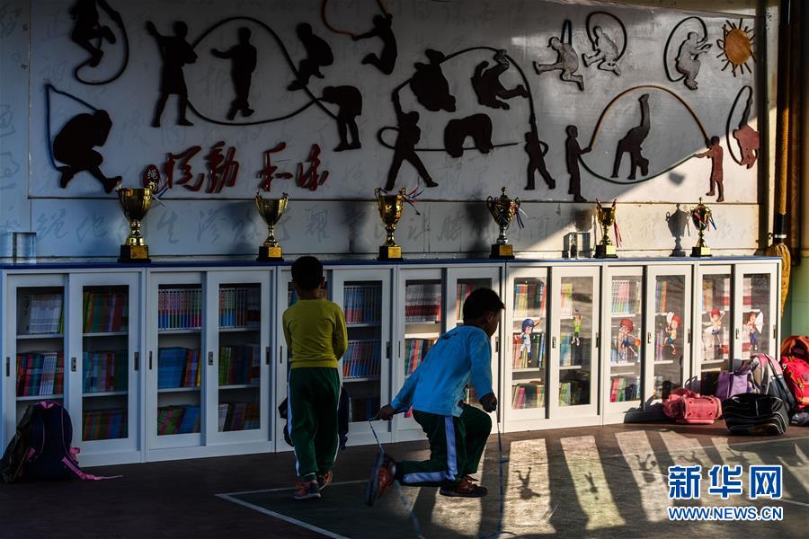 鐘煒鋒在校園小廣場(chǎng)上和同學(xué)練跳繩,當(dāng)天晚上,電影《點(diǎn)點(diǎn)星光》將在七星小學(xué)操場(chǎng)上舉行首映式(2019年11月15日攝)。新華社記者劉大偉攝