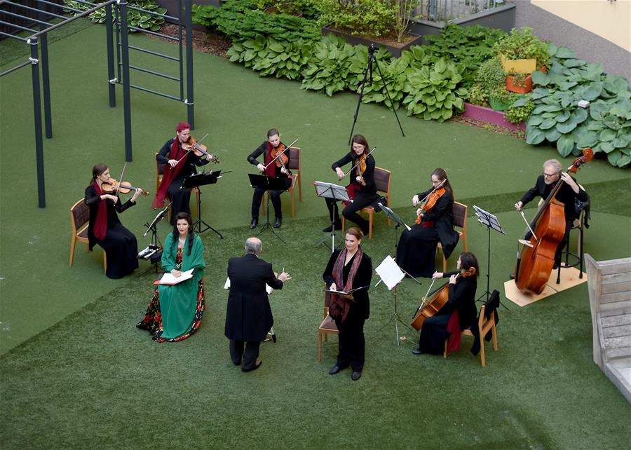 5月30日,在奧地利維也納“時代精神”酒店的庭院內(nèi),歌劇樂團為觀眾演出。當日,奧地利首都維也納的一家名為“時代精神”的酒店為迎接“解封”后恢復營業(yè),在其庭院內(nèi)舉辦“窗口音樂會”。按照奧政府此前公布的“解封”時間表,從29日起,賓館酒店以及健身房、游泳池和游樂場等休閑娛樂場所有條件恢復運營。新華社記者郭晨攝