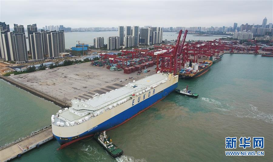 滾裝貨船“勞拉”輪駛入??谛阌⒏郏@是海南自貿區(qū)政策實施以來的首艘汽車外貿船(2月16日攝,無人機照片)。新華社記者楊冠宇攝