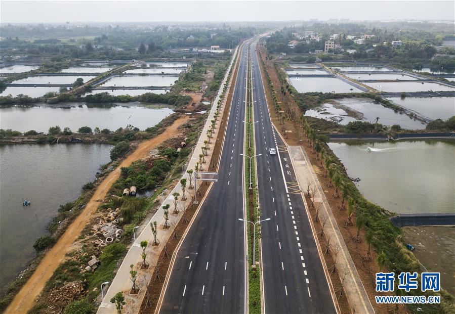這是4月1日拍攝的位于海口江東新區(qū)的東寨港大道(無人機照片)。新華社記者蒲曉旭攝