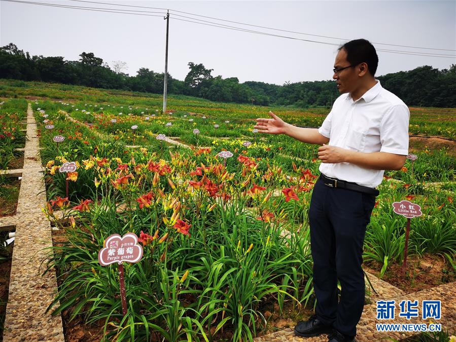 祁東縣金萱生物科技有限公司總經(jīng)理李祥勇在介紹中國(guó)黃花菜(萱草)良種繁育研究中心里的花卉品種(5月29日攝)。新華社記者袁汝婷攝