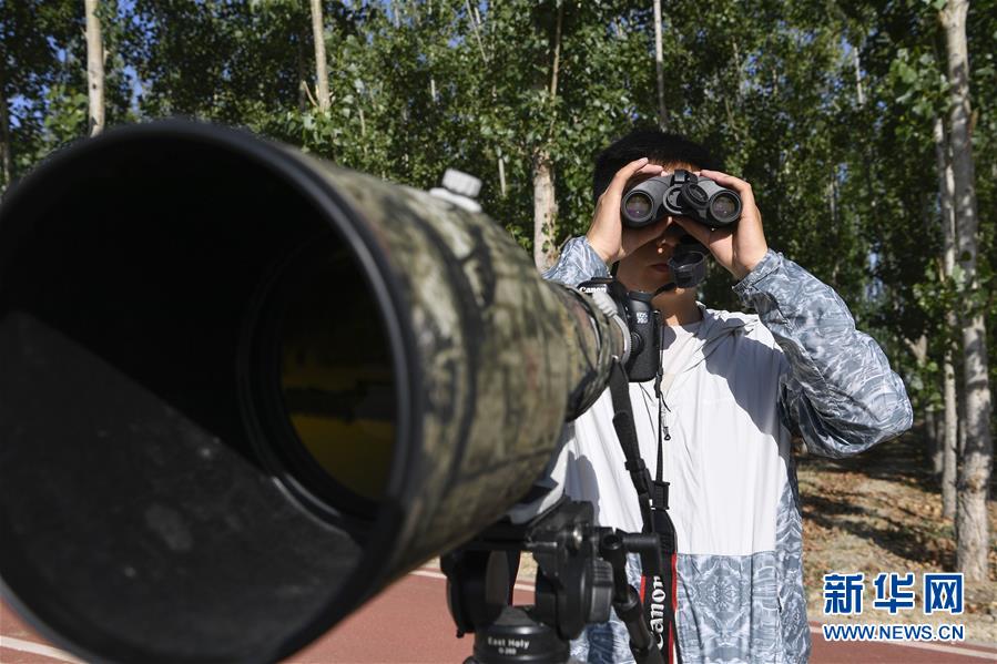 6月3日,李學(xué)明利用望遠(yuǎn)鏡觀察黃河濕地的鳥類活動(dòng)。新華社記者馮開華攝。