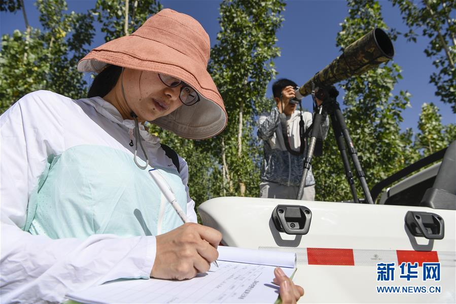 6月3日,李學(xué)明的同事張海榮(左)在填寫濕地鳥類野外監(jiān)測(cè)記錄表。新華社記者馮開華攝。