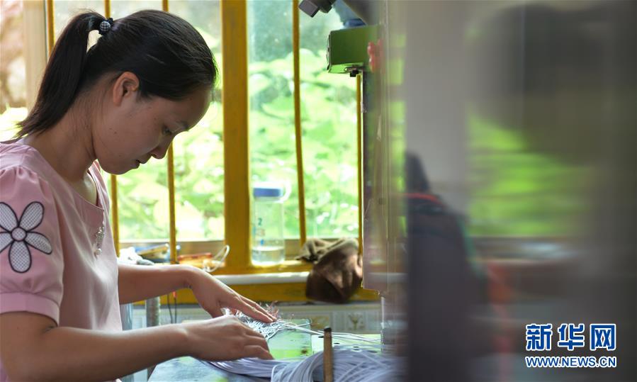 6月4日,一名女工在永州市新田縣一處易地搬遷集中安置點(diǎn)的扶貧車(chē)間里加工電器零部件。新華社記者趙眾志攝。