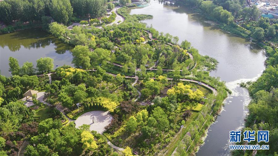 這是6月5日拍攝文安縣水景公園(無人機照片)。近年來,河北省文安縣將植樹造林與城市建設(shè)有機融合,探索“政府引導、企業(yè)運作、多方共贏”的市場化植樹造林新模式,大規(guī)模推進國土綠化,打造人與自然和諧共生的優(yōu)美生態(tài)環(huán)境,構(gòu)筑京津雄綠色屏障。截至目前,該縣森林覆蓋率已經(jīng)達到33%,城區(qū)綠地面積達到36.48%。新華社記者李曉果攝。