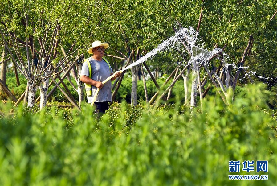 6月5日,在文安縣迎賓大道,工人給花池澆水。近年來,河北省文安縣將植樹造林與城市建設(shè)有機(jī)融合,探索“政府引導(dǎo)、企業(yè)運(yùn)作、多方共贏”的市場化植樹造林新模式,大規(guī)模推進(jìn)國土綠化,打造人與自然和諧共生的優(yōu)美生態(tài)環(huán)境,構(gòu)筑京津雄綠色屏障。截至目前,該縣森林覆蓋率已經(jīng)達(dá)到33%,城區(qū)綠地面積達(dá)到36.48%。新華社記者李曉果攝。