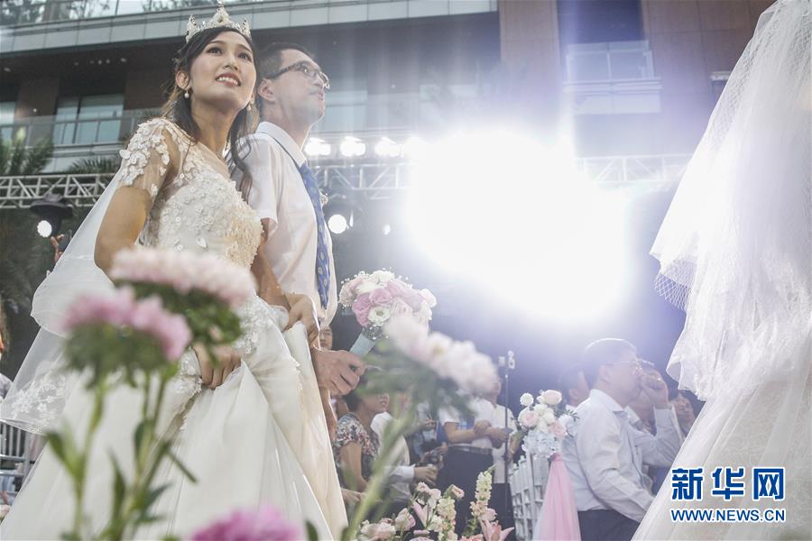 6月6日,新人在海南博鰲樂(lè)城國(guó)際醫(yī)療旅游先行區(qū)參加集體婚禮。 新華社記者 張玉薇 攝