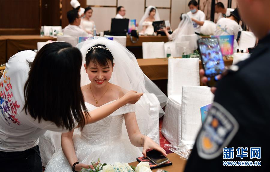 6月6日,海南省萬(wàn)寧市公安局疫情防控指揮部民警騰凱彪在為正在化妝的妻子侯俊霞拍照。 當(dāng)日,來(lái)自全國(guó)15個(gè)省份的百對(duì)新人在三亞市亞特蘭蒂斯度假區(qū)舉行了一場(chǎng)特殊的集體婚禮,每對(duì)新人中至少有一位參與過(guò)抗擊新冠肺炎疫情的工作。 新華社記者 郭程 攝