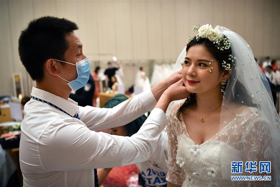 6月6日,曾支援湖北黃岡大別山區(qū)域醫(yī)療中心的湖南省人民醫(yī)院急診科護師陳建明為同為醫(yī)務(wù)人員的妻子唐嬋佩戴耳環(huán)。 當(dāng)日,來自全國15個省份的百對新人在三亞市亞特蘭蒂斯度假區(qū)舉行了一場特殊的集體婚禮,每對新人中至少有一位參與過抗擊新冠肺炎疫情的工作。 新華社記者 郭程 攝