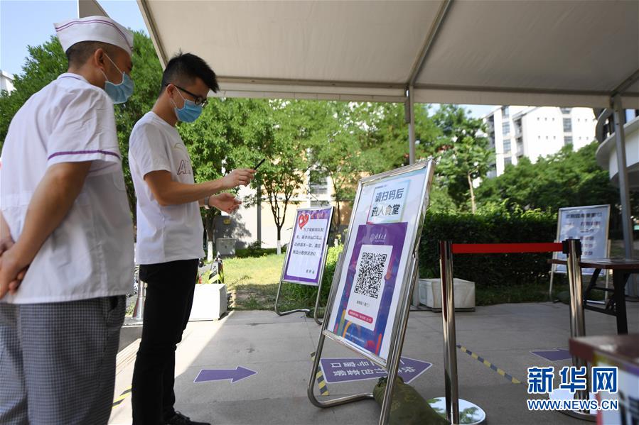 6月6日,在清華大學(xué)紫荊園食堂,學(xué)生掃碼驗證信息后進入食堂。 新華社記者 鞠煥宗 攝