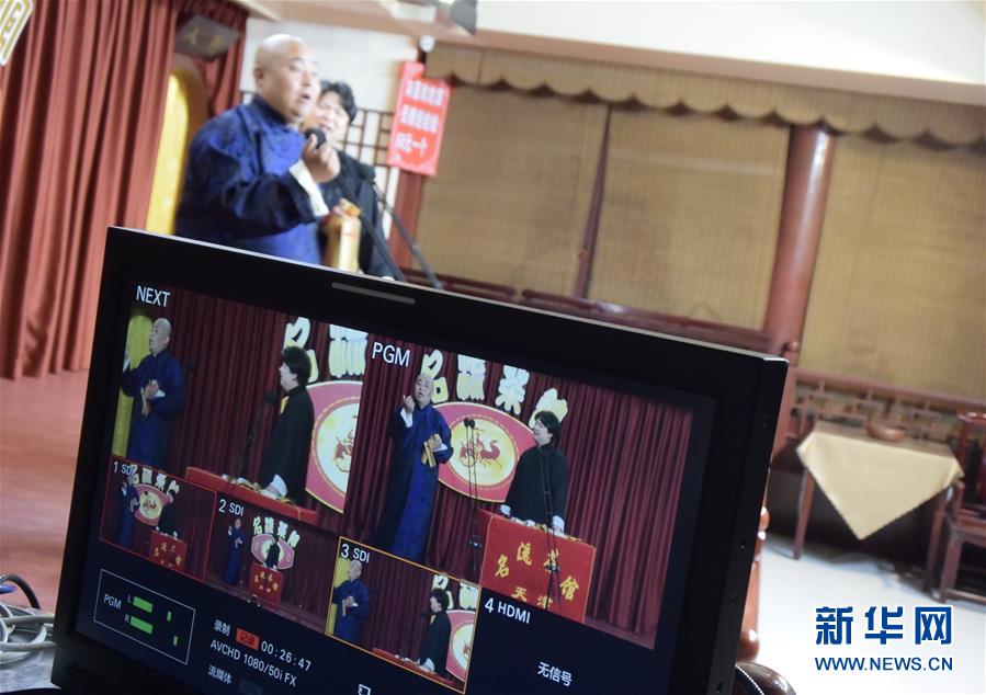 6月6日晚,天津名流茶館的相聲演員在付費(fèi)直播《名流名家“逗你玩”》演出中說相聲。隨著疫情防控形勢逐漸向好,天津的一些茶館紛紛轉(zhuǎn)戰(zhàn)“云端”說相聲,推出付費(fèi)直播演出,并邀請一些幸運(yùn)觀眾到現(xiàn)場觀看,在傳播津味相聲、培養(yǎng)年輕觀眾的同時,也為即將到來的線下演出“預(yù)熱”。新華社記者周潤健攝