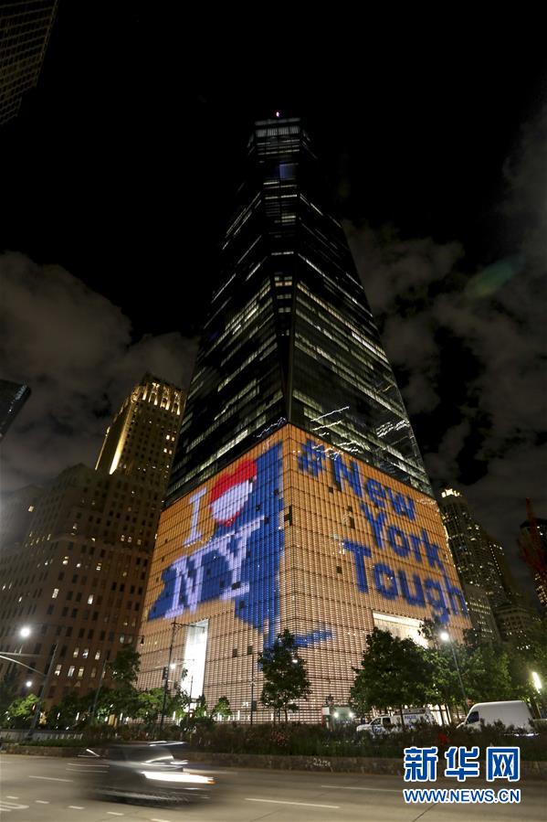 6月7日,美國(guó)紐約世貿(mào)中心一號(hào)樓外墻呈現(xiàn)出“我愛(ài)紐約”和“紐約堅(jiān)強(qiáng)”字樣。新華社記者王迎攝