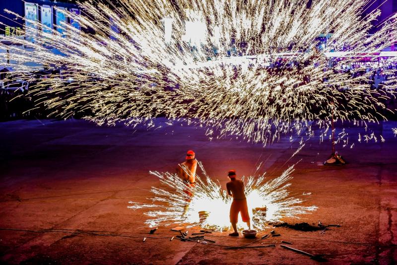 2020年6月7日晚8時許,吉林長春青岡立交橋附近,打鐵花時,先把熔好的鐵汁注入事先準備好的“花棒”。一個拳頭粗細、一尺多長的柳樹棒,棒的頂端掏有直徑3厘米的圓形坑槽,用以盛放鐵汁。打鐵花者一手拿著盛有鐵汁的“花棒”,用下棒猛擊盛有鐵汁的上棒,使棒中鐵汁沖向花棚,鐵汁遇到棚頂?shù)牧Χ派⒊鼍薮蟮幕鸹?。五彩繽紛、震天動地。