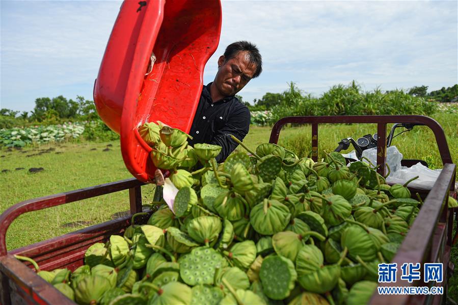 6月9日,村民在??邶埲A區(qū)龍泉鎮(zhèn)椰子頭村裝運(yùn)采摘的蓮蓬。初夏時(shí)節(jié),位于海南海口龍華區(qū)龍泉鎮(zhèn)的蓮蓬逐漸成熟,當(dāng)?shù)卮迕窦泳o采摘,一派繁忙景象。新華社記者蒲曉旭攝