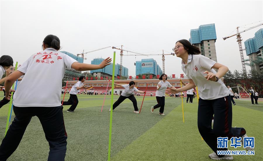 6月9日,河北省衡水市第二中學的高三學生在操場上參加減壓趣味游戲。2020年高考臨近,河北省衡水市第二中學組織開展多種形式的集體“減壓”活動,幫助高三學生在緊張備考之余釋放身心壓力,以輕松、樂觀、自信的心態(tài)迎接高考。新華社記者朱旭東攝
