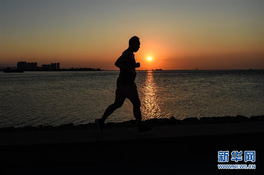 夜幕將至,一位市民在海口世紀(jì)公園濱海步道跑步(5月15日拍攝)。近年來,夜跑成為越來越多都市人熱衷的健身方式之一。在海南???,每當(dāng)夜幕降臨,“夜跑族”來到??谌f綠園、世紀(jì)公園等夜跑場所跑步,用一身酣暢淋漓的汗水?dāng)[脫白天工作中的壓力,享受跑步帶來的歡愉。新華社記者 蒲曉旭 攝