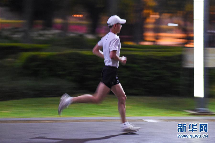 一位市民在海口萬綠園夜跑(5月28日拍攝)。近年來,夜跑成為越來越多都市人熱衷的健身方式之一。在海南??冢慨?dāng)夜幕降臨,“夜跑族”來到海口萬綠園、世紀(jì)公園等夜跑場所跑步,用一身酣暢淋漓的汗水?dāng)[脫白天工作中的壓力,享受跑步帶來的歡愉。新華社記者 蒲曉旭 攝