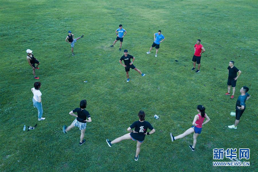 6月11日傍晚,在海口萬(wàn)綠園,市民在夜跑前做熱身運(yùn)動(dòng)(無(wú)人機(jī)拍攝)。近年來(lái),夜跑成為越來(lái)越多都市人熱衷的健身方式之一。在海南??冢慨?dāng)夜幕降臨,“夜跑族”來(lái)到海口萬(wàn)綠園、世紀(jì)公園等夜跑場(chǎng)所跑步,用一身酣暢淋漓的汗水?dāng)[脫白天工作中的壓力,享受跑步帶來(lái)的歡愉。新華社記者 蒲曉旭 攝