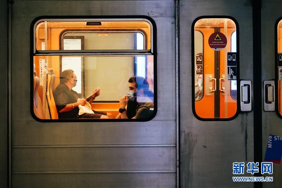 6月13日,乘客戴口罩在比利時(shí)布魯塞爾乘坐地鐵。新華社記者 張鋮 攝