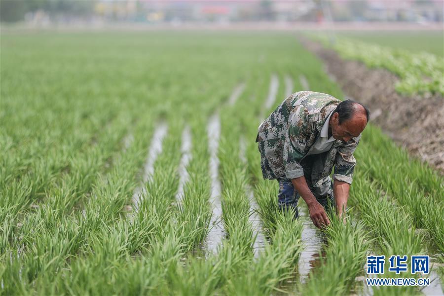 6月17日,農(nóng)民在盤錦市盤山縣太平街道張家村的稻田間查看水稻秧苗生長情況。新華社記者 潘昱龍 攝