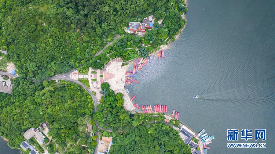 6月21日,游客乘船在紅楓湖景區(qū)游覽(無人機照片)。夏至時節(jié),貴州省清鎮(zhèn)市紅楓湖景區(qū)草木蒼翠,秀麗的湖光山色吸引不少游客前來游玩。新華社記者陶亮攝