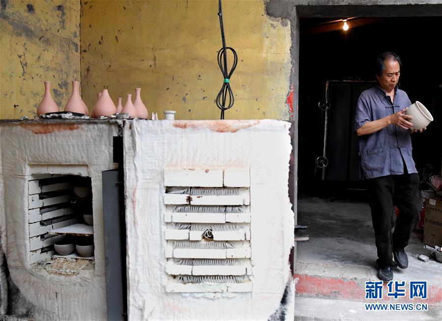 在河南省鞏義市站街鎮(zhèn)小黃冶村的工作室里,游光明在裝窯(6月19日攝)。新華社記者李安攝