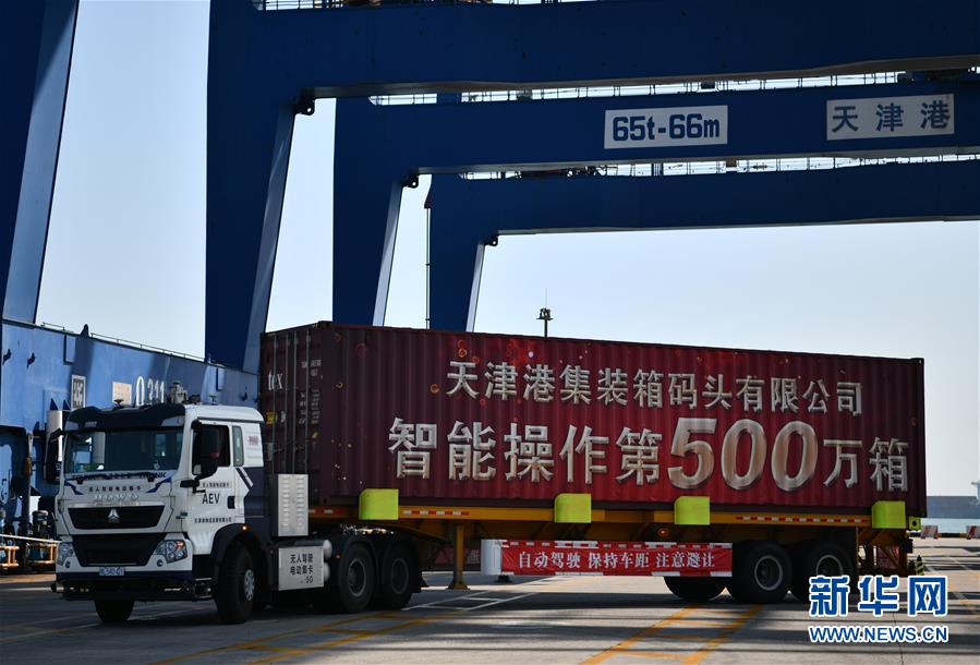 在天津港集裝箱碼頭有限公司北區(qū)智能碼頭自動化堆場,裝載著集裝箱的無人駕駛電動集裝箱卡車向碼頭駛?cè)ィ?019年9月26日攝)。新華社記者李然攝