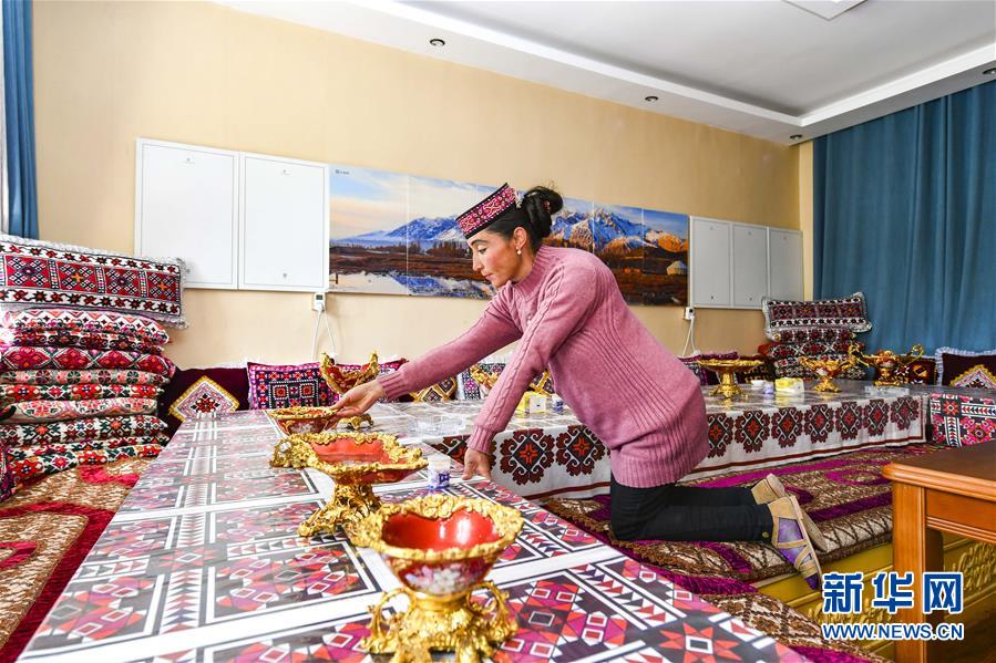 新疆塔什庫爾干塔吉克自治縣塔什庫爾干鄉(xiāng)瓦爾希迭村村民瑪依努爾古麗·依克木在民宿內(nèi)擺放物品,準(zhǔn)備招待游客(6月4日攝)。新華社記者胡虎虎攝