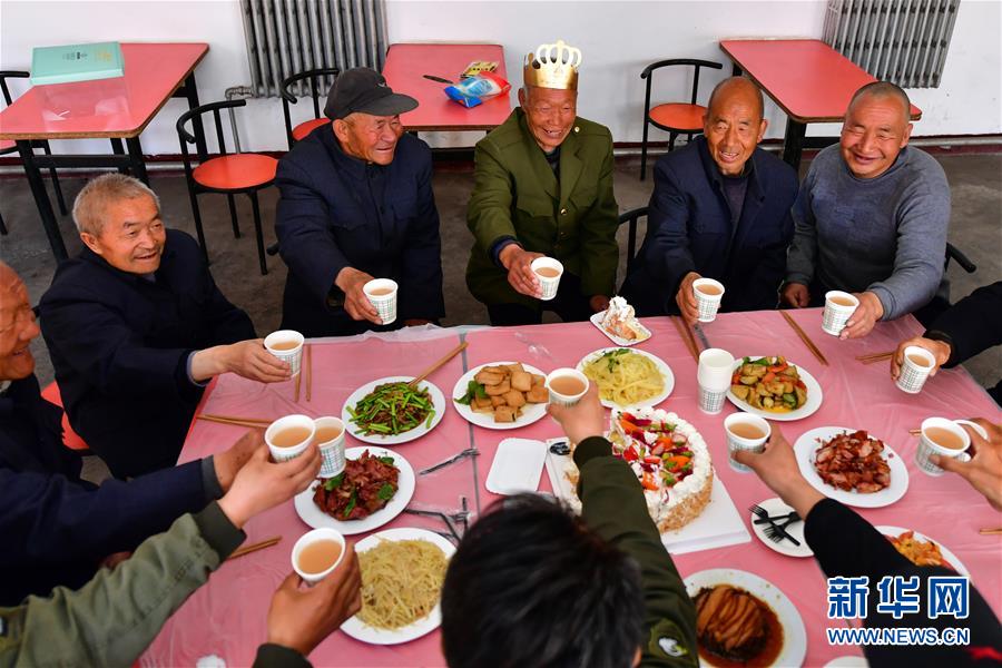 山西省壺關(guān)縣石坡鄉(xiāng)雙井村的“五保戶”李松興(右三)在石坡鄉(xiāng)養(yǎng)老院過生日(4月22日攝)。新華社記者曹陽(yáng)攝