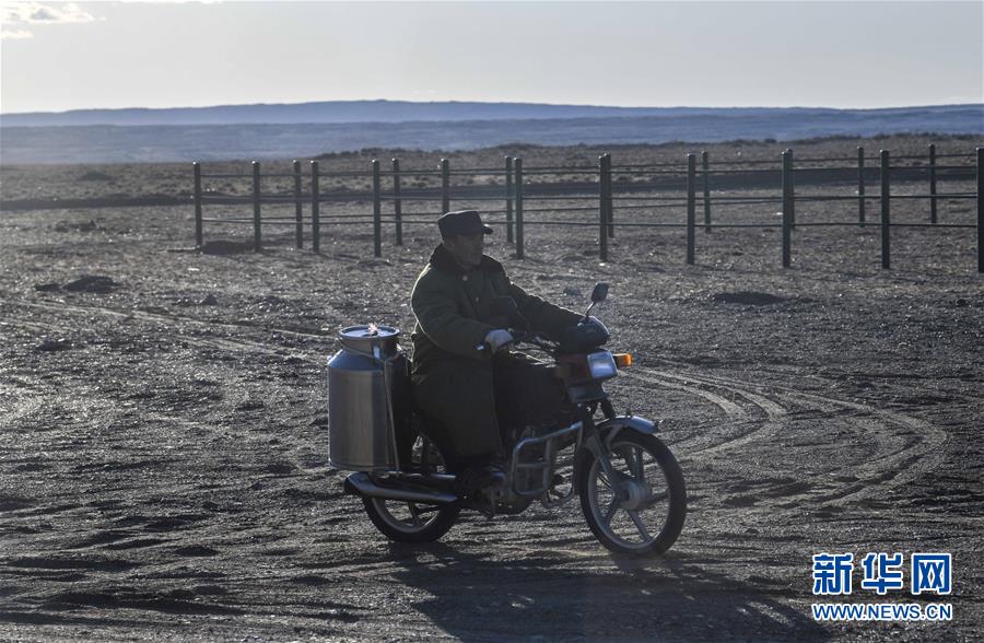 在吉木乃縣萬(wàn)駝園內(nèi),傍晚時(shí)分,牧民米拉木別克·阿依提克準(zhǔn)備騎著摩托車(chē)將駱駝趕回圈內(nèi)(6月21日攝)。