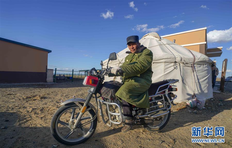 在吉木乃縣萬駝園內(nèi),傍晚時(shí)分,牧民米拉木別克·阿依提克準(zhǔn)備騎著摩托車將駱駝趕回圈內(nèi)(6月21日攝)。新華社記者趙戈攝