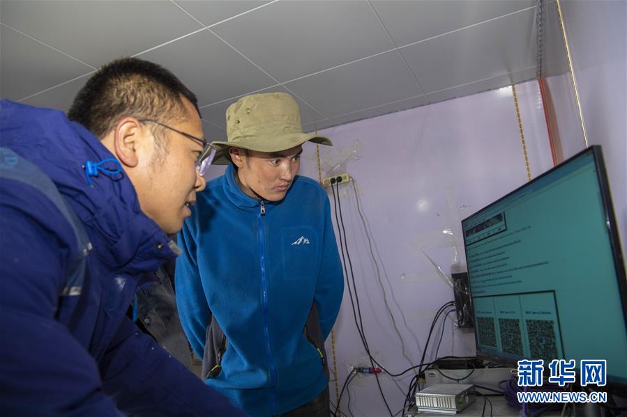 在中國科學院新疆天文臺慕士塔格觀測站,馮國杰(左)為助理觀測員阿克力·圖拉提講解當晚觀測要點(6月15日攝)。新華社記者胡虎虎攝