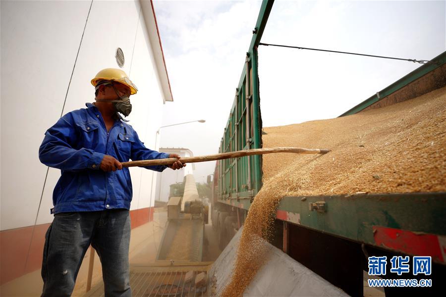6月23日,在河北柏鄉(xiāng)國家糧食儲(chǔ)備庫,工作人員將小麥入庫。麥?zhǔn)者^后,河北柏鄉(xiāng)國家糧食儲(chǔ)備庫積極騰倉納糧,做好夏糧收儲(chǔ)入庫工作,確保農(nóng)民順利賣糧。新華社記者王曉攝