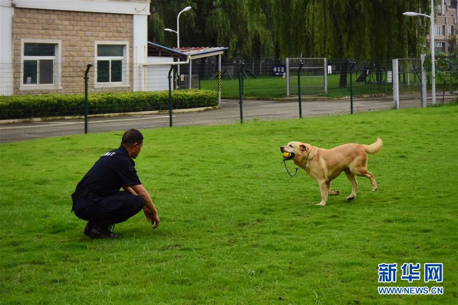 6月24日,訓(xùn)導(dǎo)員周吉榮和緝毒犬“多多”在訓(xùn)練場上互動(dòng)。 新華社記者 鄭夢雨 攝