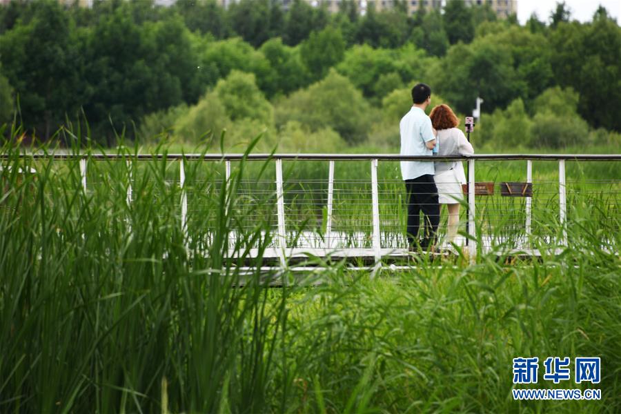 6月25日,市民在哈爾濱大劇院附近的濕地公園拍照。新華社記者 王建威 攝