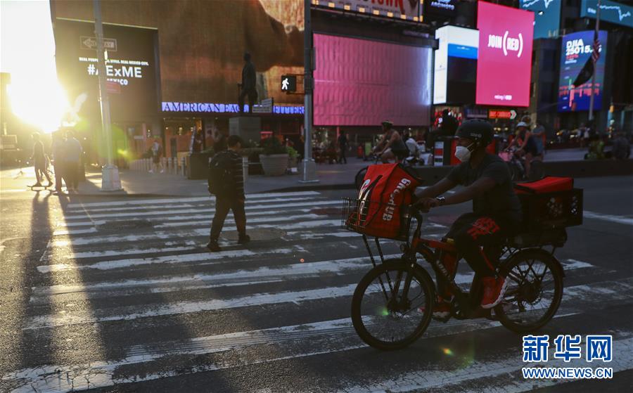 6月27日,一名送貨員騎車經(jīng)過(guò)美國(guó)紐約時(shí)報(bào)廣場(chǎng)。美國(guó)約翰斯·霍普金斯大學(xué)27日發(fā)布的新冠疫情最新統(tǒng)計(jì)數(shù)據(jù)顯示,截至美國(guó)東部時(shí)間27日16時(shí)35分(北京時(shí)間28日4時(shí)35分),美國(guó)累計(jì)新冠確診病例2500419例,累計(jì)死亡病例125434例。新華社記者王迎攝