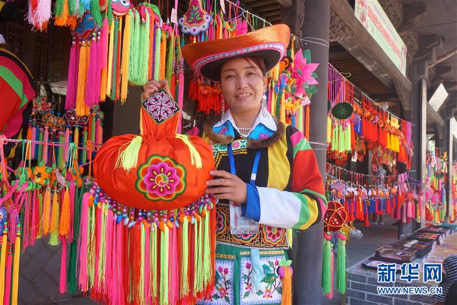 6月24日,繡娘胡蘭索卡在青海省互助土族自治縣舉辦的端午節(jié)香包“選美”大賽上展示她的作品。新華社記者解統(tǒng)強攝