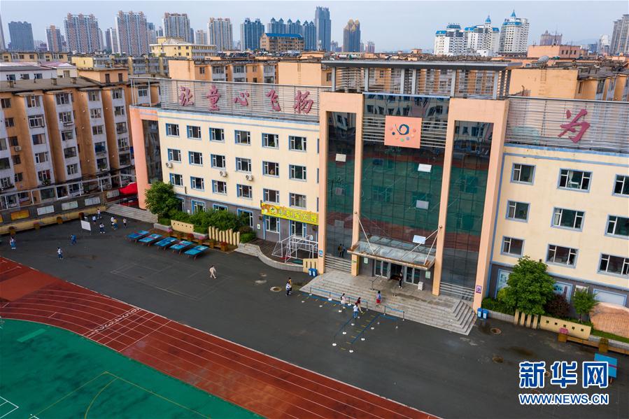 6月29日,在吉林市第一實(shí)驗(yàn)小學(xué),學(xué)生陸續(xù)進(jìn)入教學(xué)樓(無人機(jī)照片)。新華社記者張楠攝