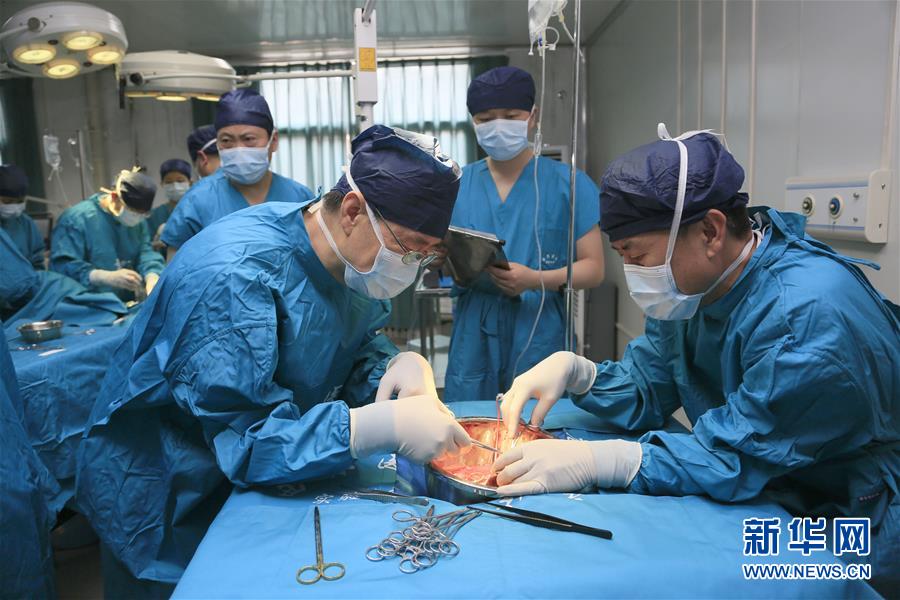 豬-猴異種肝心腎器官移植手術(shù)現(xiàn)場(6月13日攝)。日前,多基因編輯豬-恒河猴異種肝、心、腎器官移植在位于陜西西安的空軍軍醫(yī)大學(xué)西京醫(yī)院順利實(shí)施。研究團(tuán)隊(duì)使用豬內(nèi)源性逆轉(zhuǎn)錄病毒(PERV)敲除的13個(gè)基因修飾豬作為供體,將一個(gè)供體豬的肝、心、腎分別移植給3只恒河猴受體。目前,移植肝和對(duì)應(yīng)的受體猴已存活16天,突破國際上的豬-猴輔助性肝移植最長存活時(shí)間記錄。這項(xiàng)研究有助于未來解決器官短缺造成的臨床器官移植發(fā)展受限難題。新華社發(fā)(張懿楠攝)
