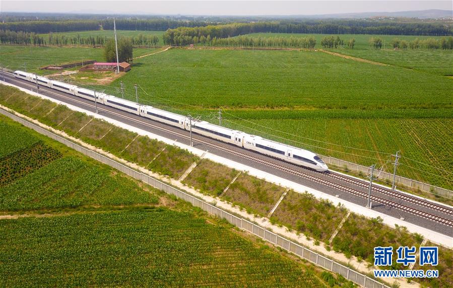 一列“和諧號”動車組列車行駛在內(nèi)蒙古赤峰市元寶山區(qū)的田野間(6月30日攝,無人機照片)。新華社記者彭源攝