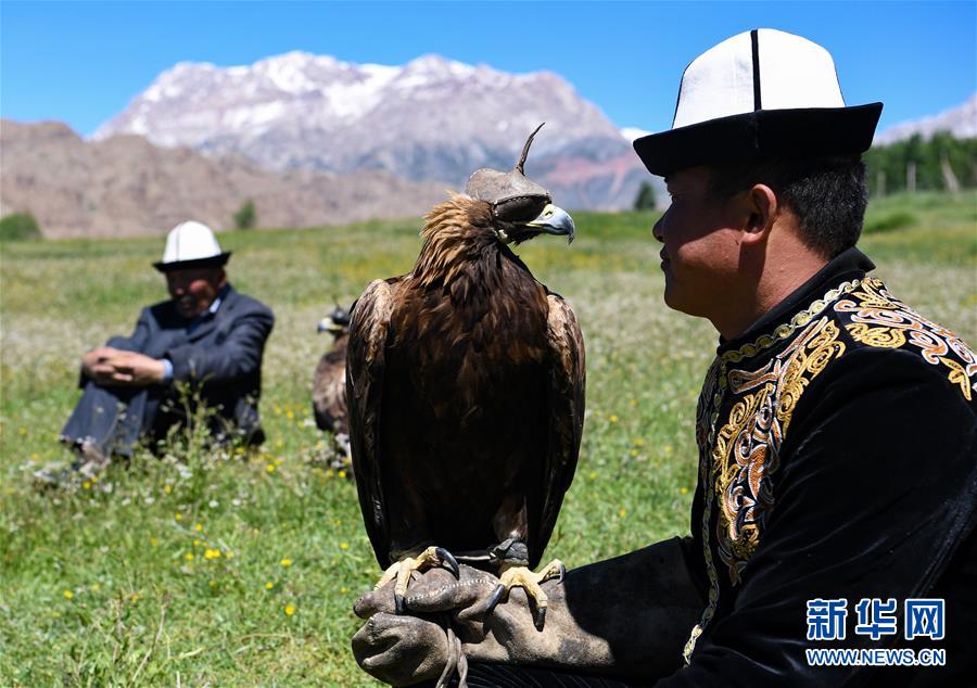 6月29日,庫爾馬西·胡特曼的徒弟們圍坐在草地上交流馴鷹技藝。新華社記者宋彥樺攝