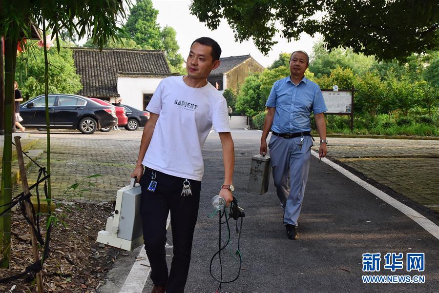 6月30日,朱生榮(右)和兒子朱強(qiáng)(左)攜帶放映設(shè)備來到馬鳴村將軍湖廣場。新華社記者鄭夢雨攝